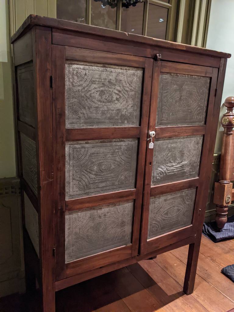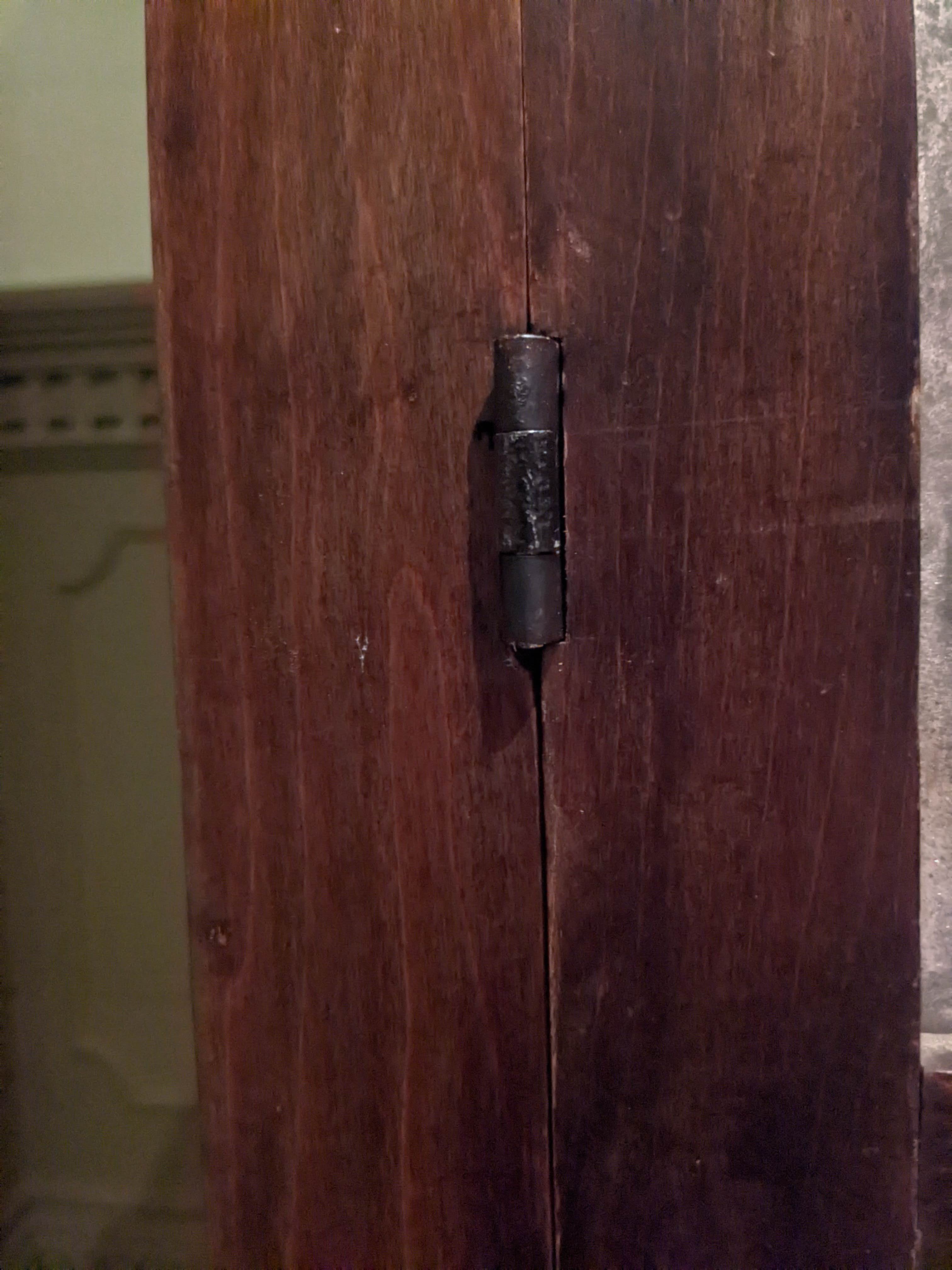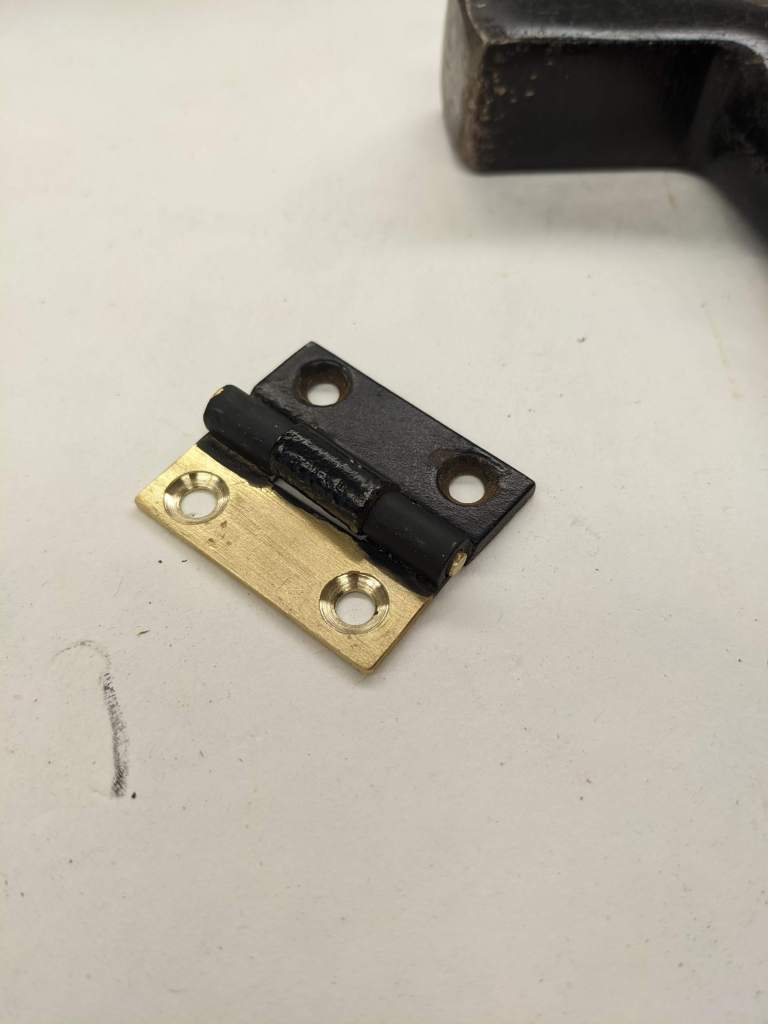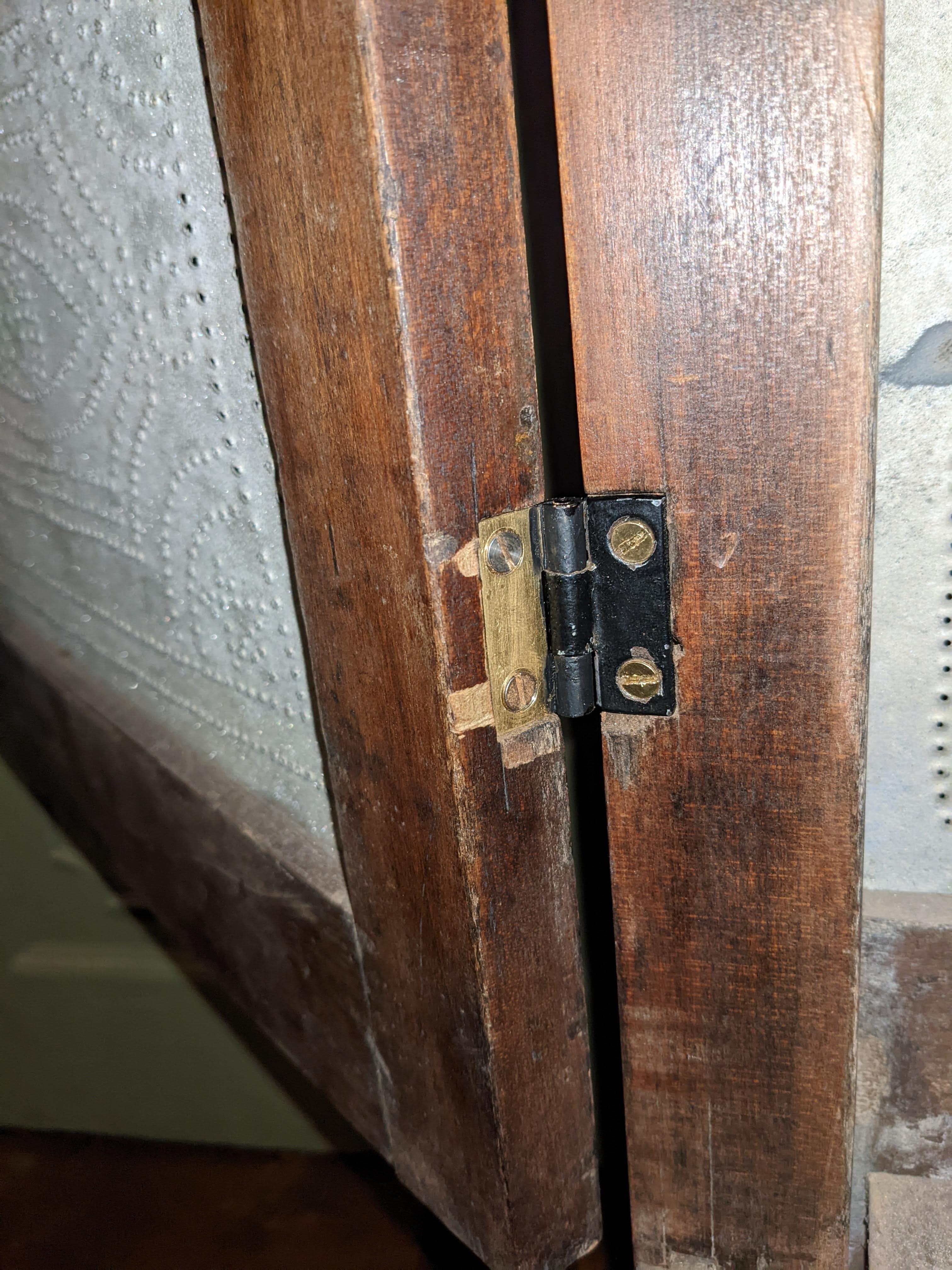 This pie safe in the Winterthur collection was missing half of the lower proper right hinge. This put significant stress on the door and the frame to which the hinge was attached. When a replacement hinge could not be found that properly matched, I took measurements of the original hinge and created a replacement from brass available in the metals lab. Only the exterior of the hinge was toned, in order to blend visually, while the interior was left untoned to clearly distinguish the replacement.