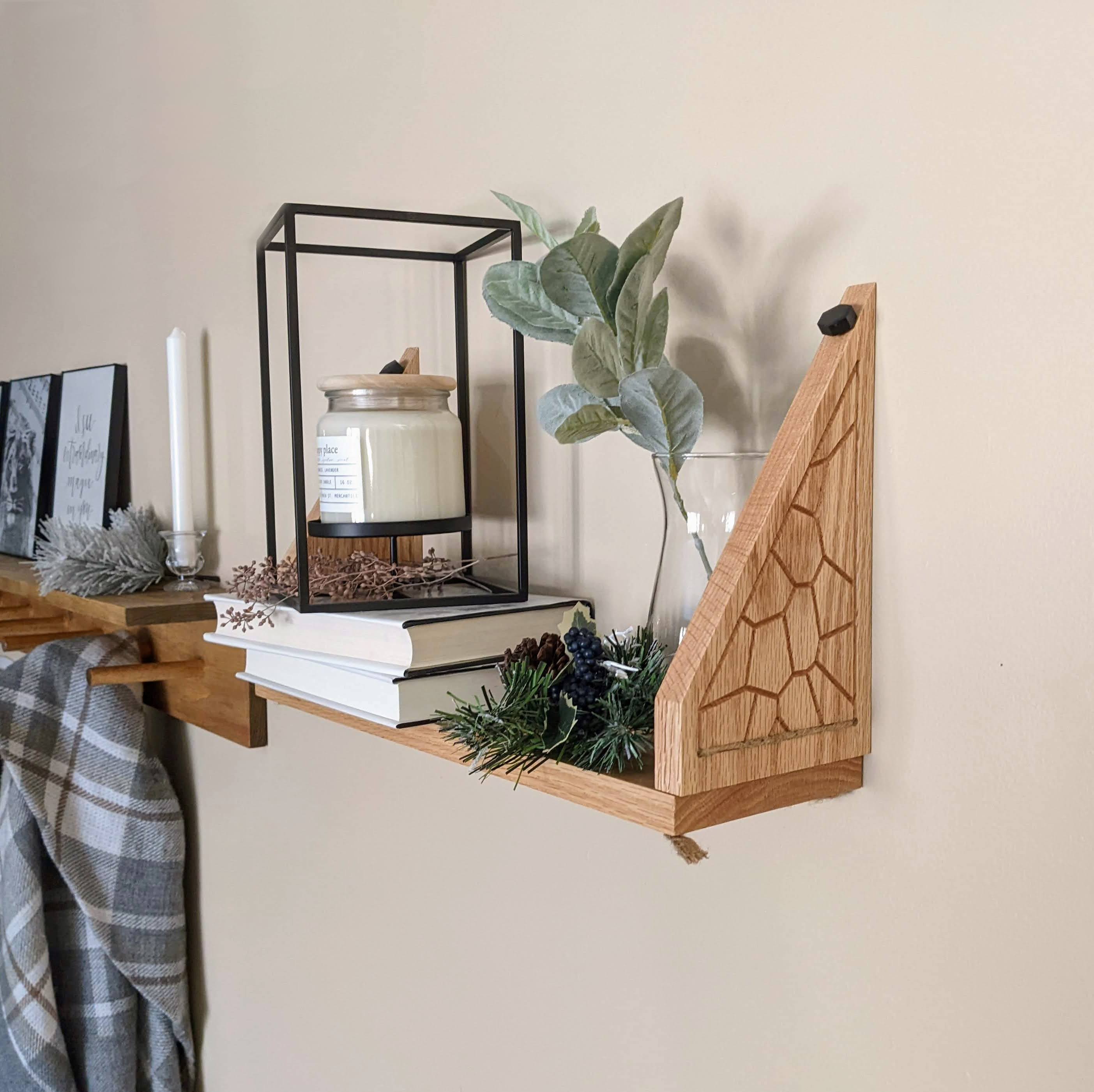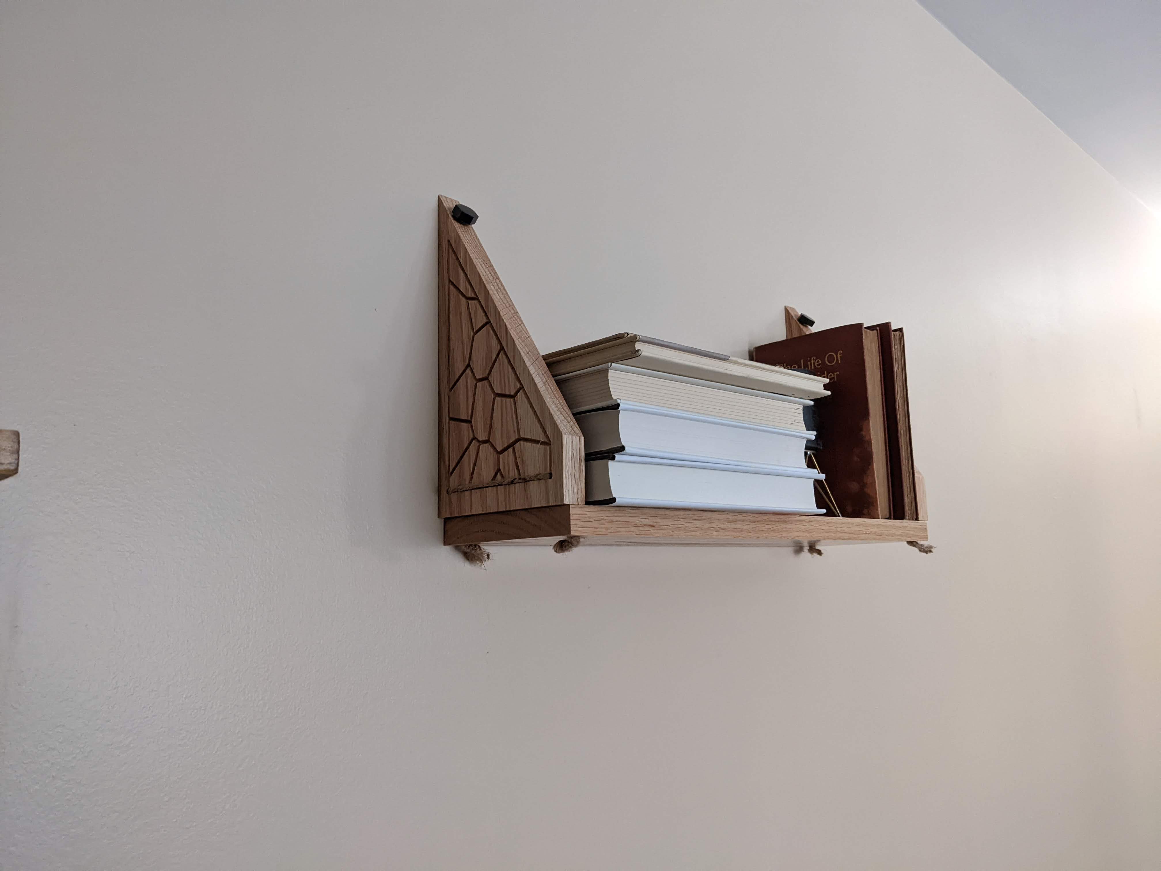 These shelves were designed to be easy to install, cause minimal damage to walls (handy for renters!), and hold lots of weight. They install with custom-molded pushpins and can hold up to 20lb–more than capable of being stacked with books.