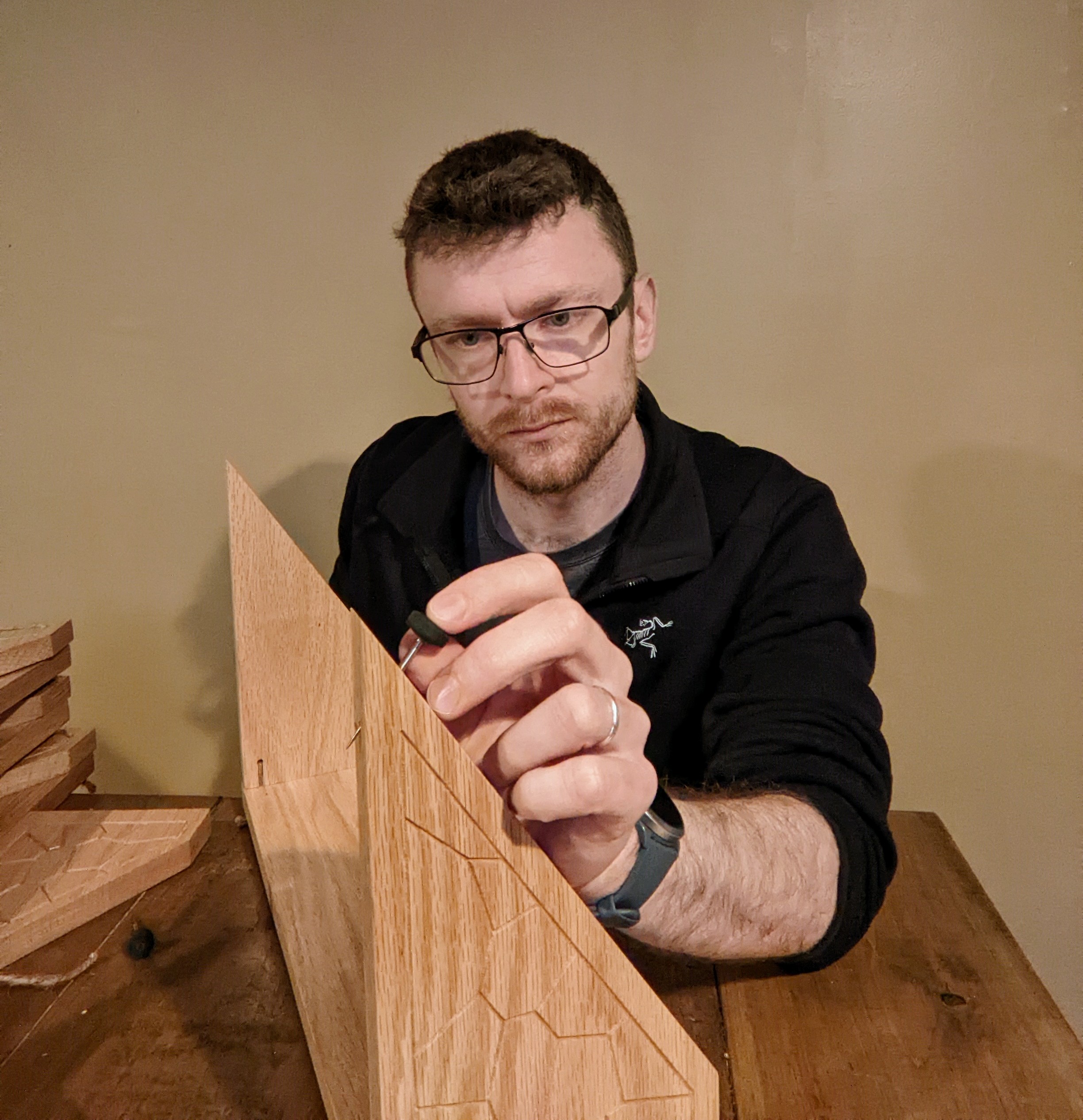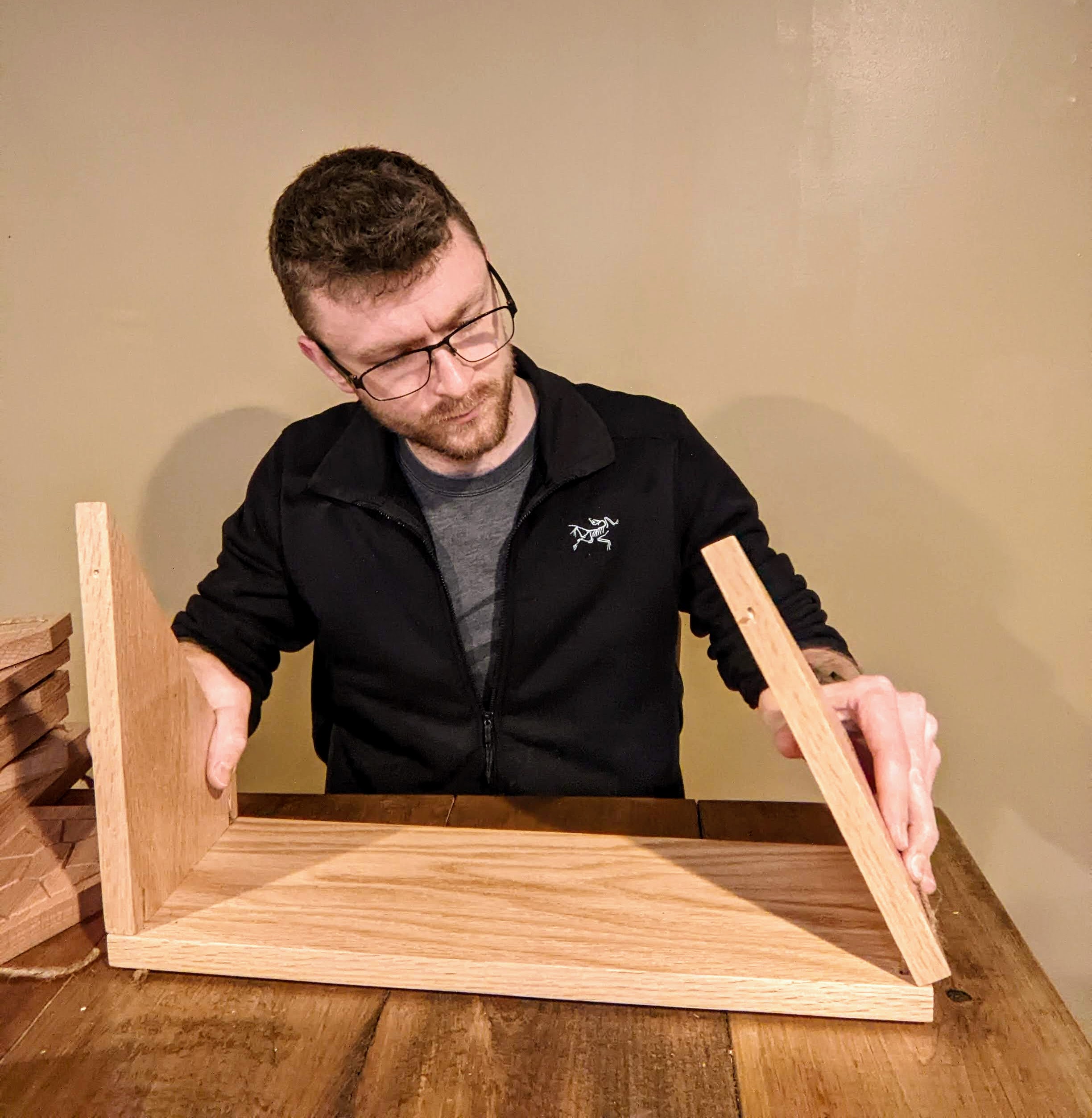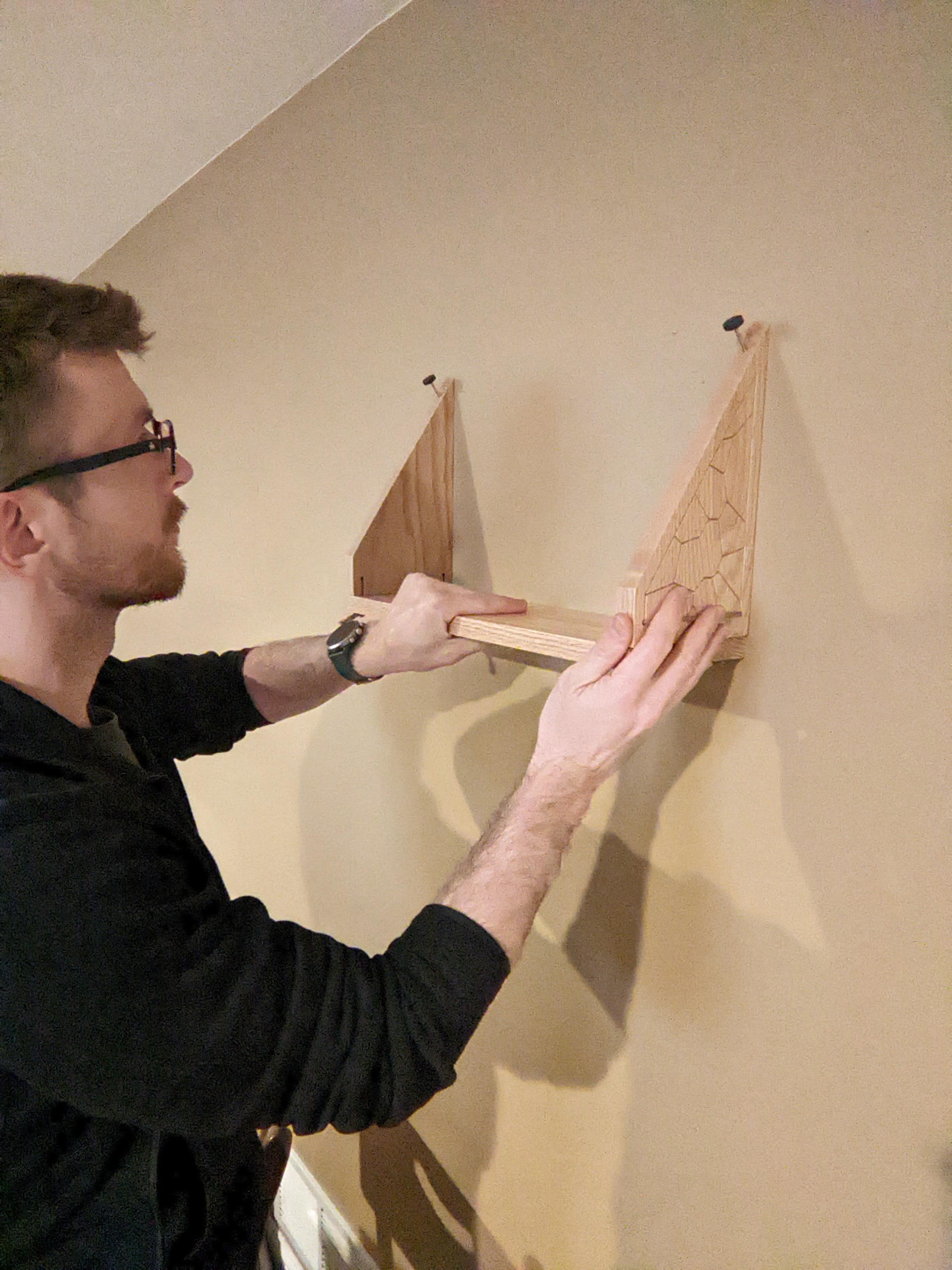 Installation can be done in under 30 seconds (my record is 28); 1) flip brackets upright, 2) insert custom pins, 3) hold in place on the wall, 4) gently hammer the pins in either by hand or with a hammer. Done!