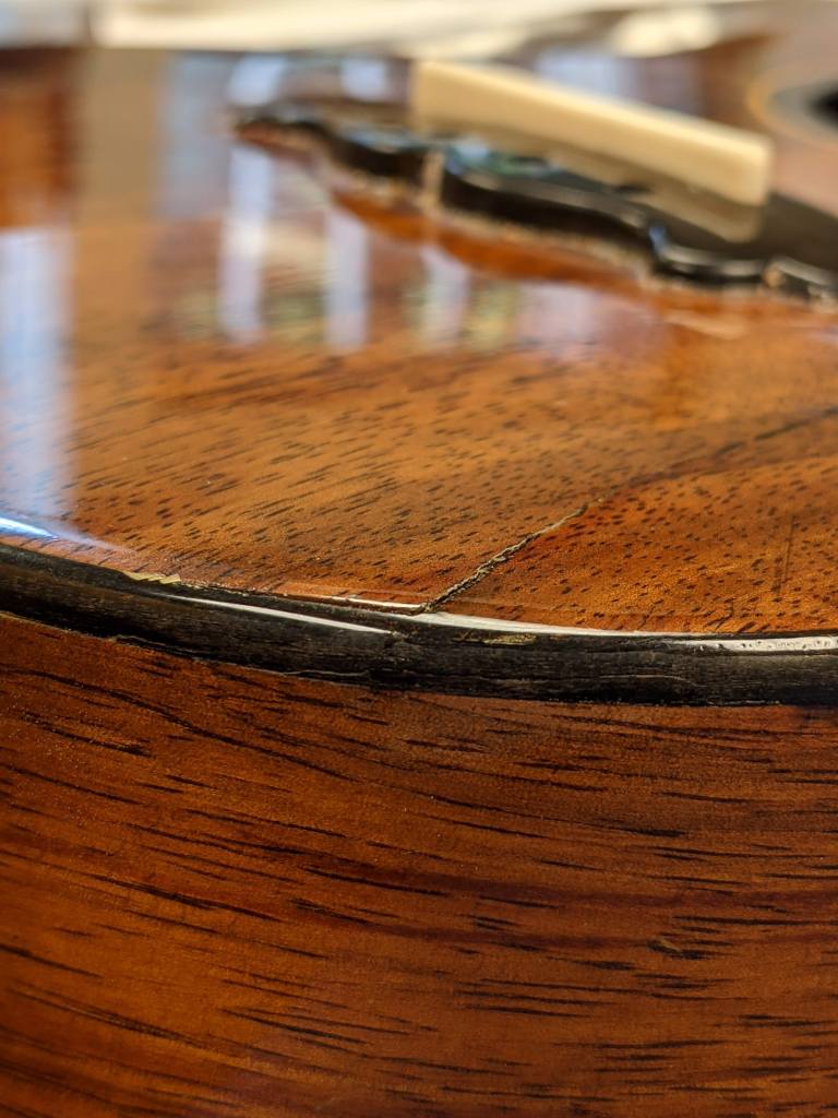 The treatment included removal of the split edge binding, injecting hide glue into the split. A wood patch to bridge the crack was made and applied to the inside of the instrument with extra-strength magnets. Then a section of replacement edge binding was created from ebony. This section was steam bent, applied, and shaped to fit. The finish was then refreshed with french polish.