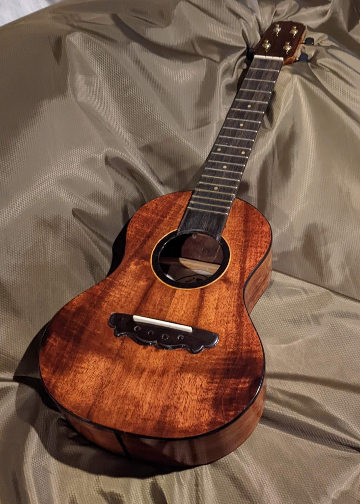 This ukulele is a handmade instrument from Hawai’i, which experienced a significant split when it was transported to the dry environment of Texas. This treatment was a structural repair, and needed to continue to be playable.