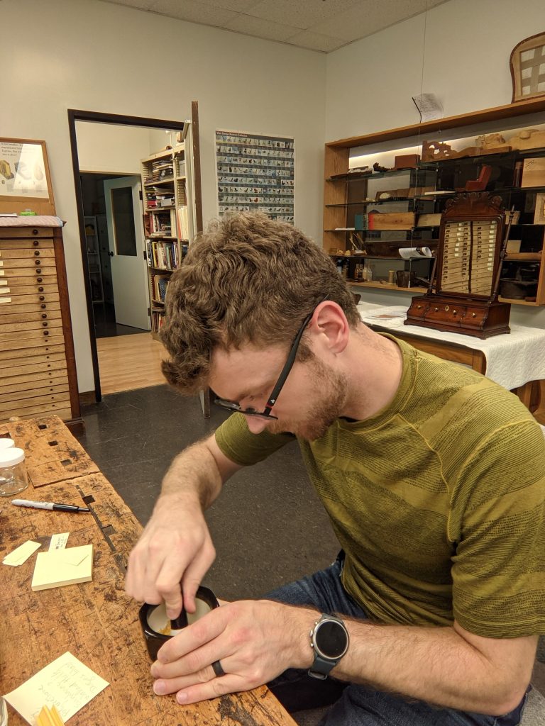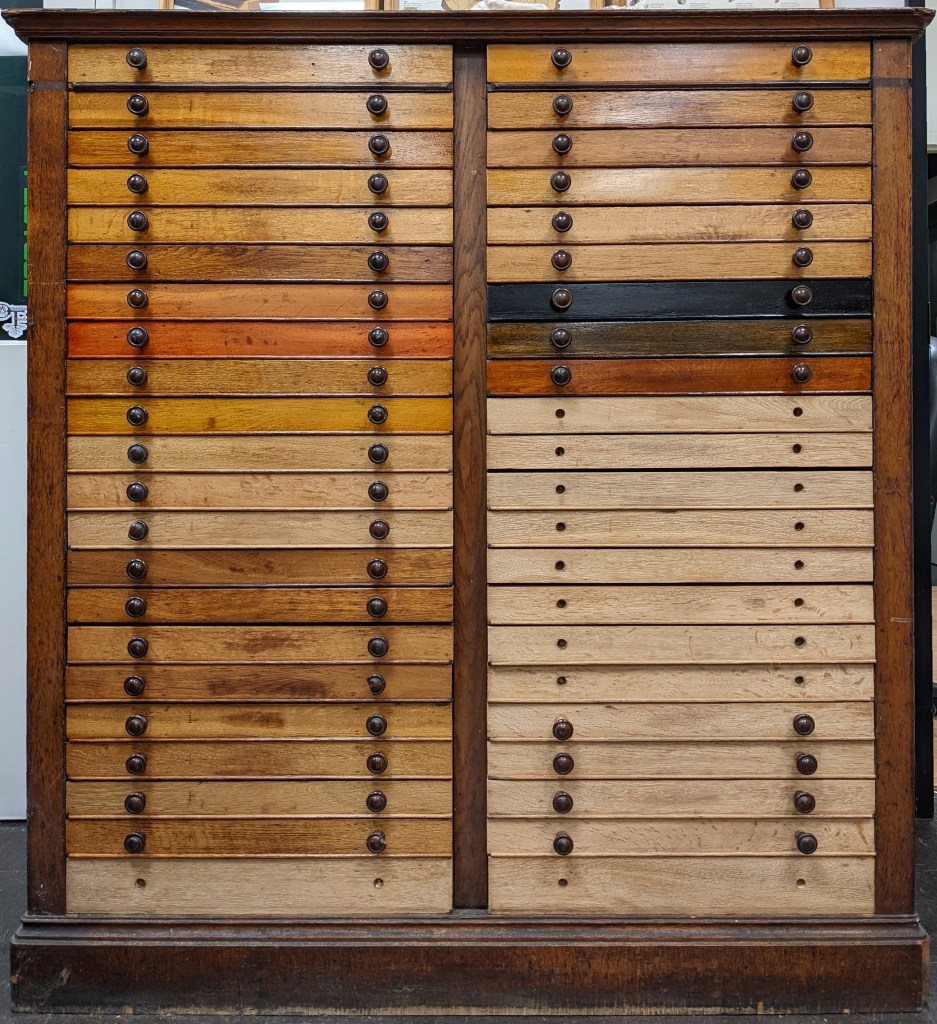 This project was to create a sample cabinet of many different historic wood finish and stain recipes. Using a variety of sources, I recreated mixtures of shellac, French polish, ebonizing, waxes, and others. The intent with this cabinet is to provide a reference for wood finishes for future research and comparison for collections objects.